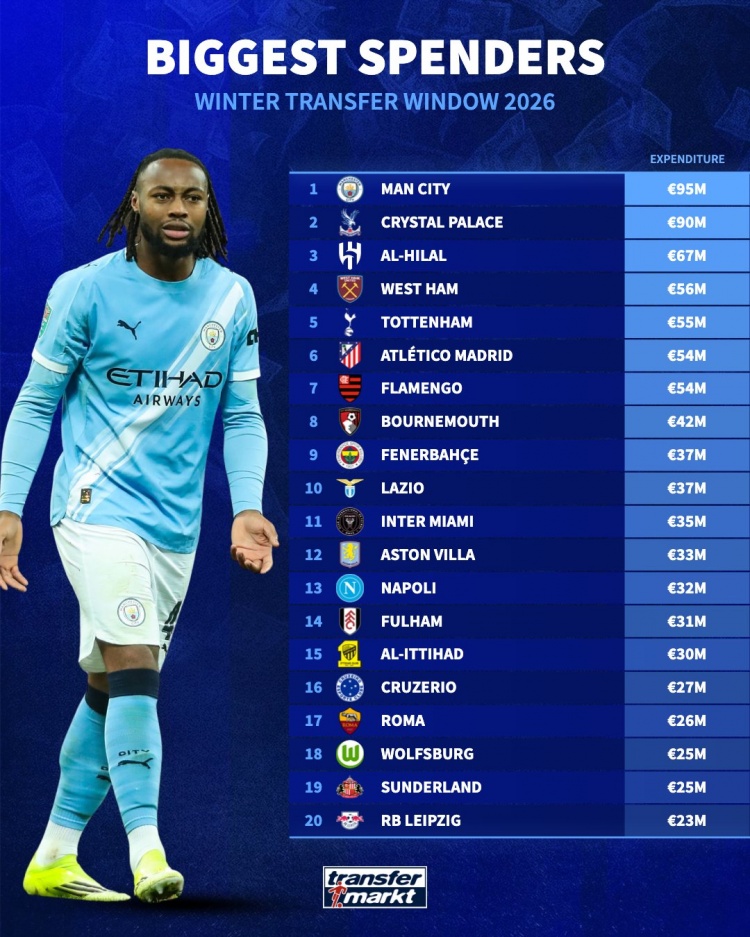 开云体育-冬窗引援花费排行:曼城9500万欧居首,迈阿密国际3500万欧第11